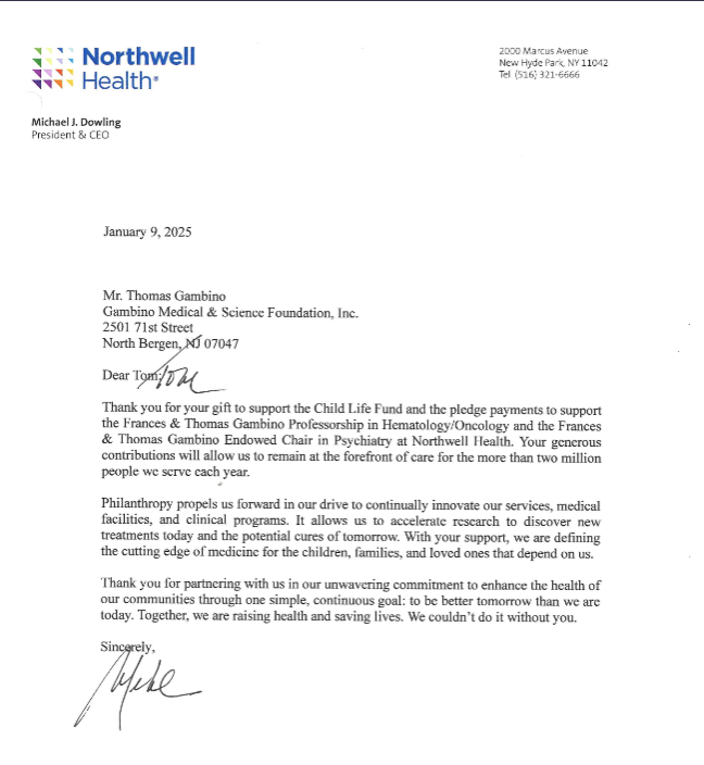 Northwell Health sends a thank you to Gambino Medical & Science Foundation for their generous gifts. January 22, 2025 Read More